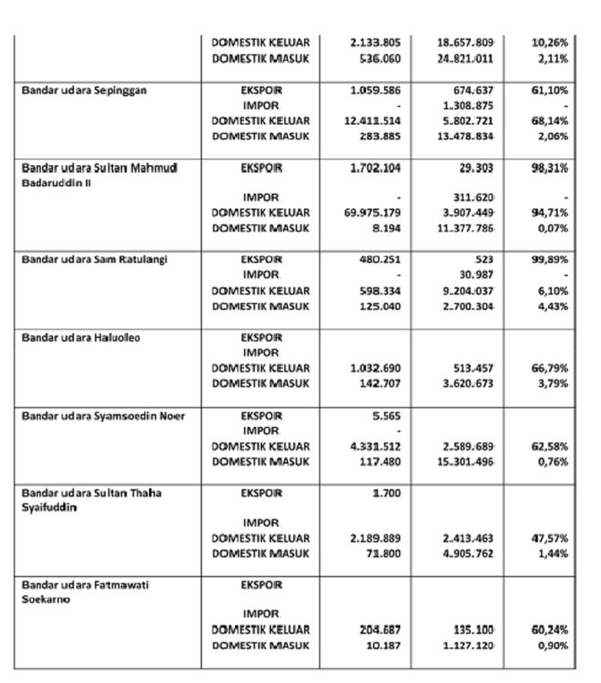 Data dari kantor perwakilan Badan Karantina Ikan, Pengendalian Mutu dan Keamanan Hasil Perikanan menunjukkan bahwa presentase muatan kargo udara berupa hasil perikanan cukup mendominasi di banyak pelabuhan udara.